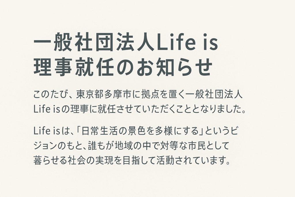 このたび、Be a Smile代表 山田真伸が、東京都多摩市に拠点を置く 一般社団法人Life is の理事に就任させていただくこととなりました。 https:…