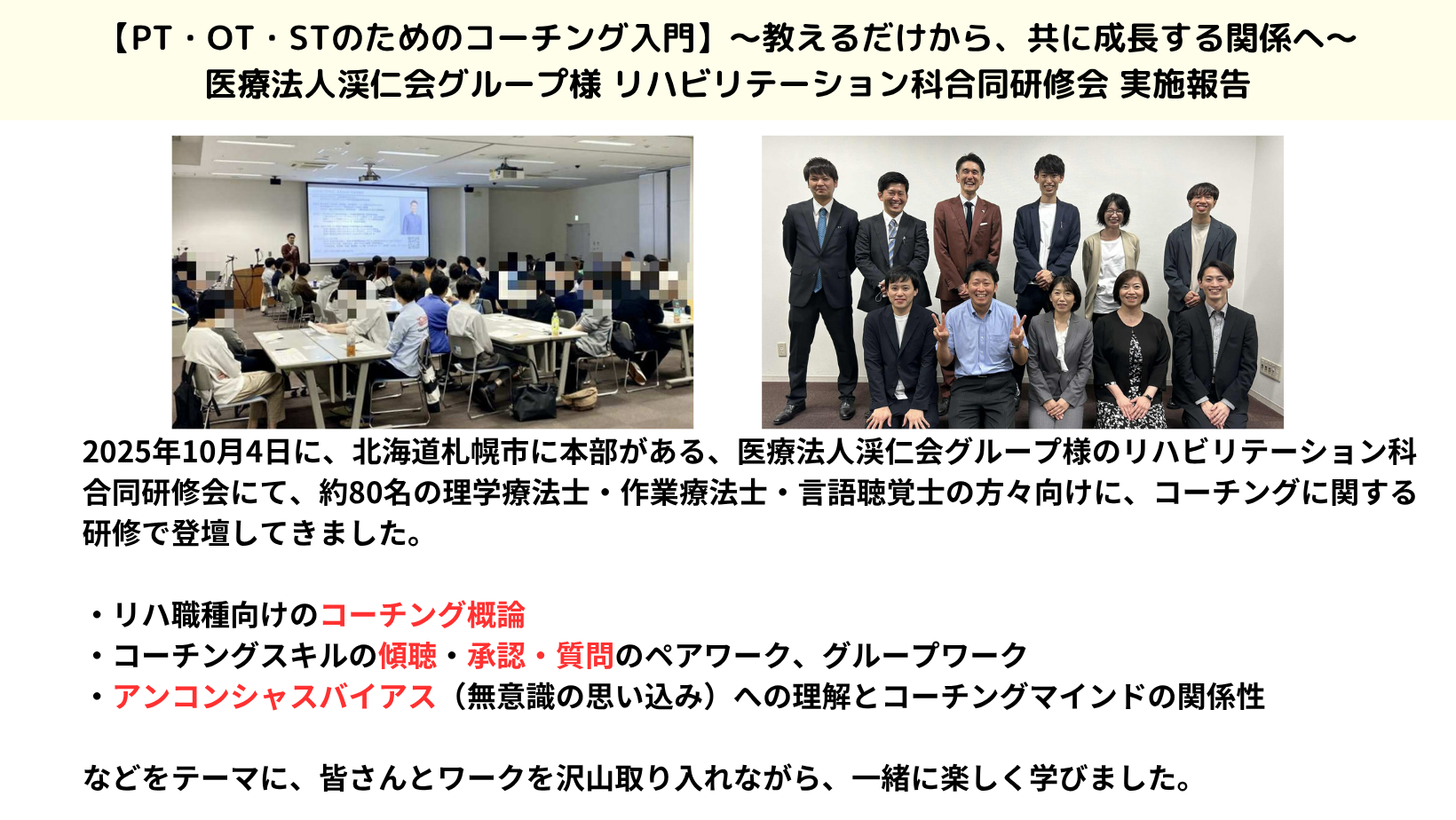 2025年10月4日、北海道札幌市に本部を置く医療法人渓仁会グループ様のリハビリテーション科合同研修会にて、約80名の理学療法士・作業療法士・言語聴覚士の皆さまと一緒に、コーチングの基礎をテーマに学びの時間を共にしました。