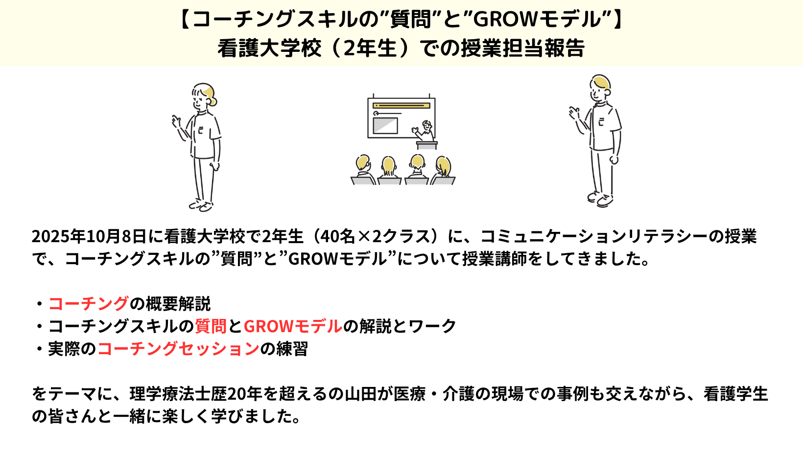 2025年10月8日、いつもお世話になっている株式会社MCP(メディカルコミュニケーションポート)様の廣田早恵美コーチよりご依頼をいただき、看護大学校にて、コミュニケーションリテラシー(コーチング)の授業を担当させていただきました。